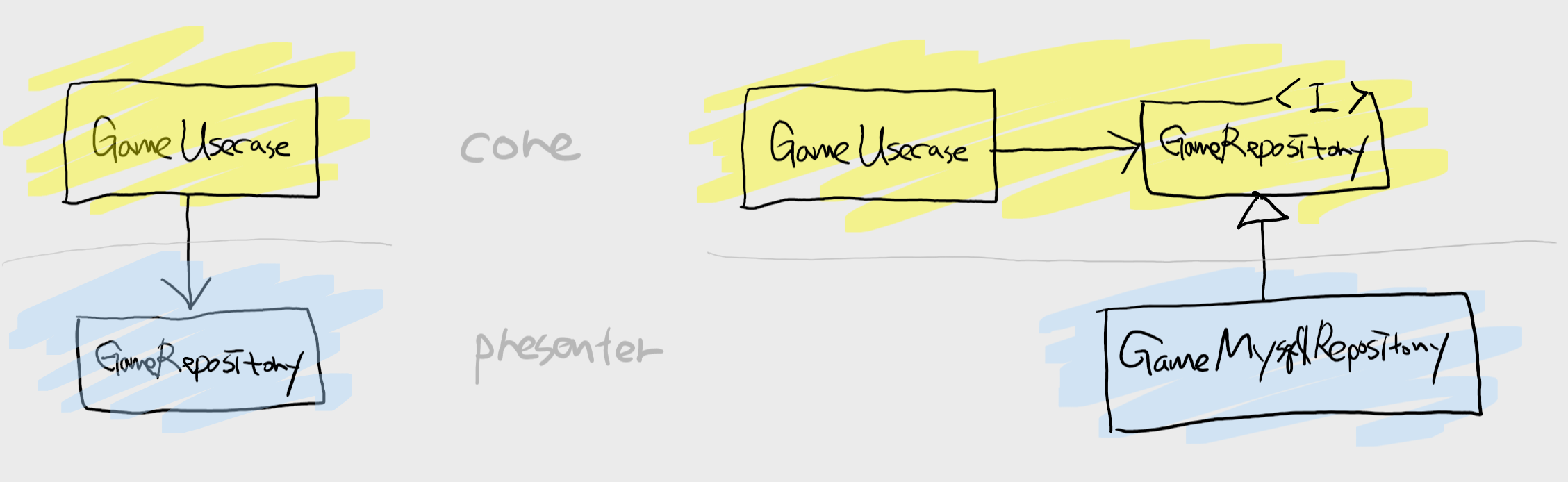 위에서 구현했던 GameRepository를 예를 들면, 이녀석의 핵심 기능만 인터페이스로 만든 후 Core 에 위치 시킨 후 이를 구현하는 GameMysqlRepository를 구현해서 Presenter 에 위치시킨다면 화살표 방향이 Presenter -> Core 로 바뀐다. 즉, Dependency Inversion 이 일어난 것이다. 이제 Core 에서 GameRepository 인터페이스를 사용하는 녀석은 MySQL 이라는 세부사항에 대해서 알 필요가 없어진다.