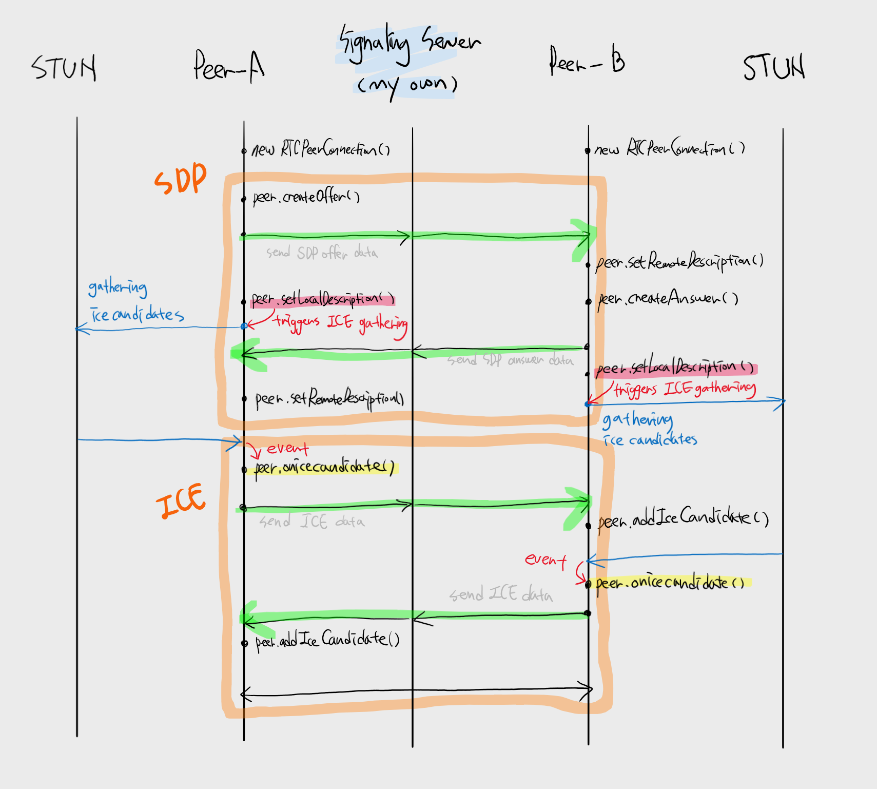 일단 크게 SDP 과정과 ICE 프로토콜 과정으로 나눠진다.