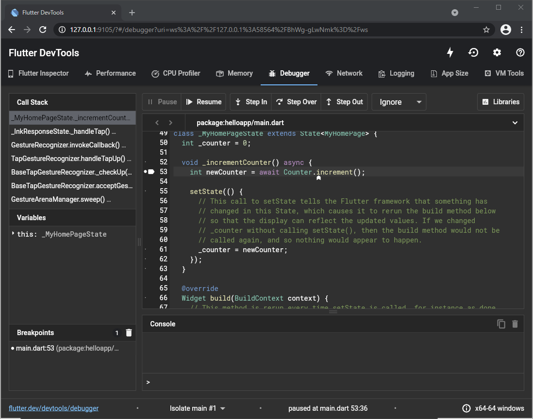 Dart 코드 개발하고 플러그인으로 Native 코드까지 개발한 후에 서로 통신하는 것 까지 봤으니 못할게 없다. 이제 브레이크포인트를 잡고 Dart / Native 영역을 넘나들며 라인단위로 디버깅해보자.