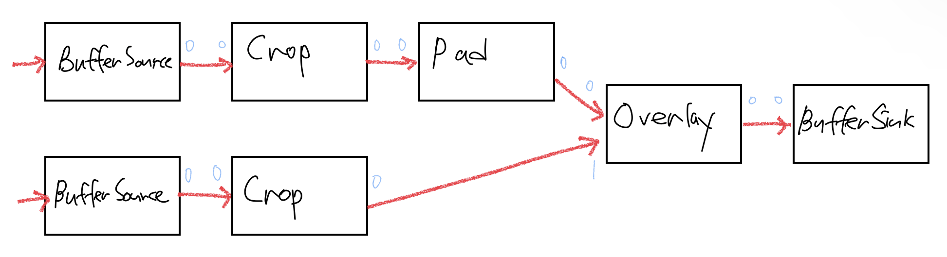 자 그럼 이를 코드로 적용하려면 어떻게 해야할까? 우리가 3번에서 작업했던 코드의 핵심 흐름은 input frame -> buffer source -> filters.. -> buffer sink -> output frame 인데 입력이 여러개가 될 수 있으므로 input frame -> buffer source 들이 각각 추가되는 방식으로 생각해볼 수 있겠다. 이를 좀 더 도식화해보자.