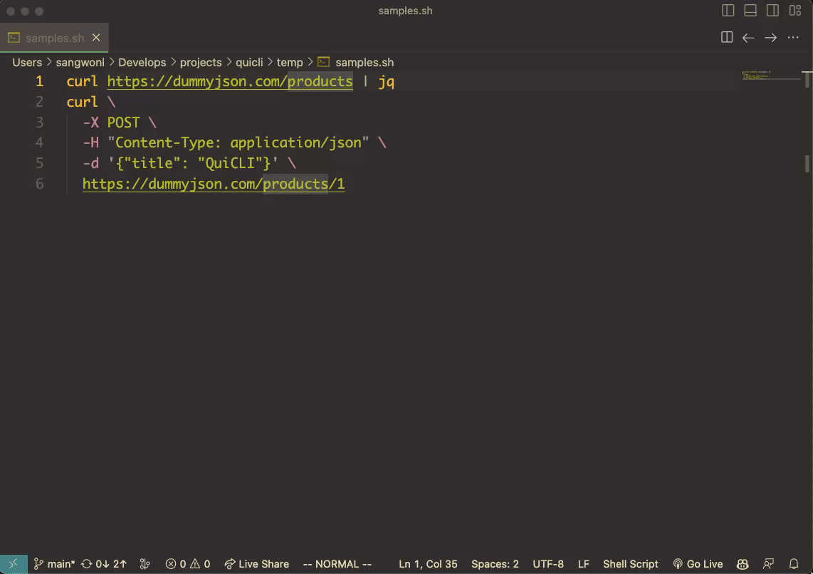 에디터 본문에서 현재 커서에 위치한 라인의 Shell Command 를 추출하고 이를 Terminal 에서 실행해주는 간단한 익스텐션이다. VS Code Extension 탭에서 `QuiCLI` 를 검색하거나 마켓플레이스를 통해서도 설치 가능하다. 소스코드는 여기에 있다.