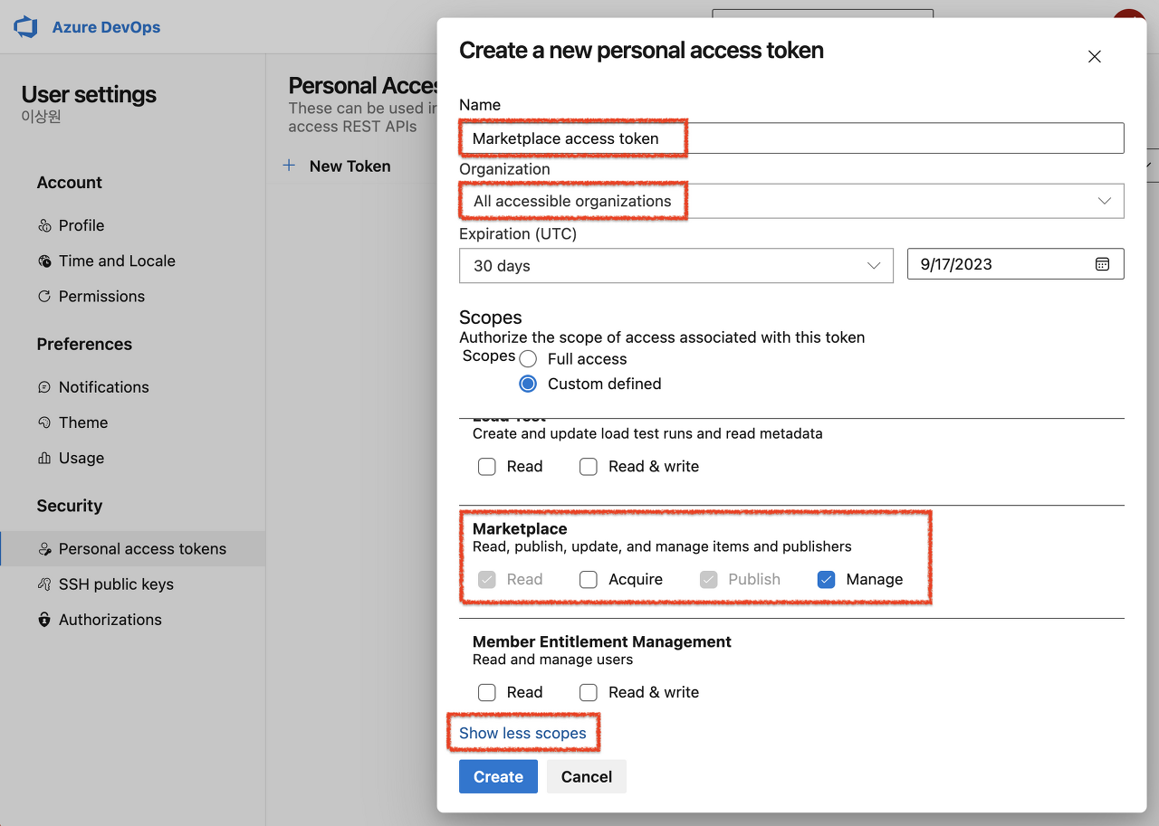 Azure DevOps 에서 Organization 을 하나 생성하고 다시 Visual Studio Marketplace 로 돌아와 Personal Access Token 을 하나 생성한다.