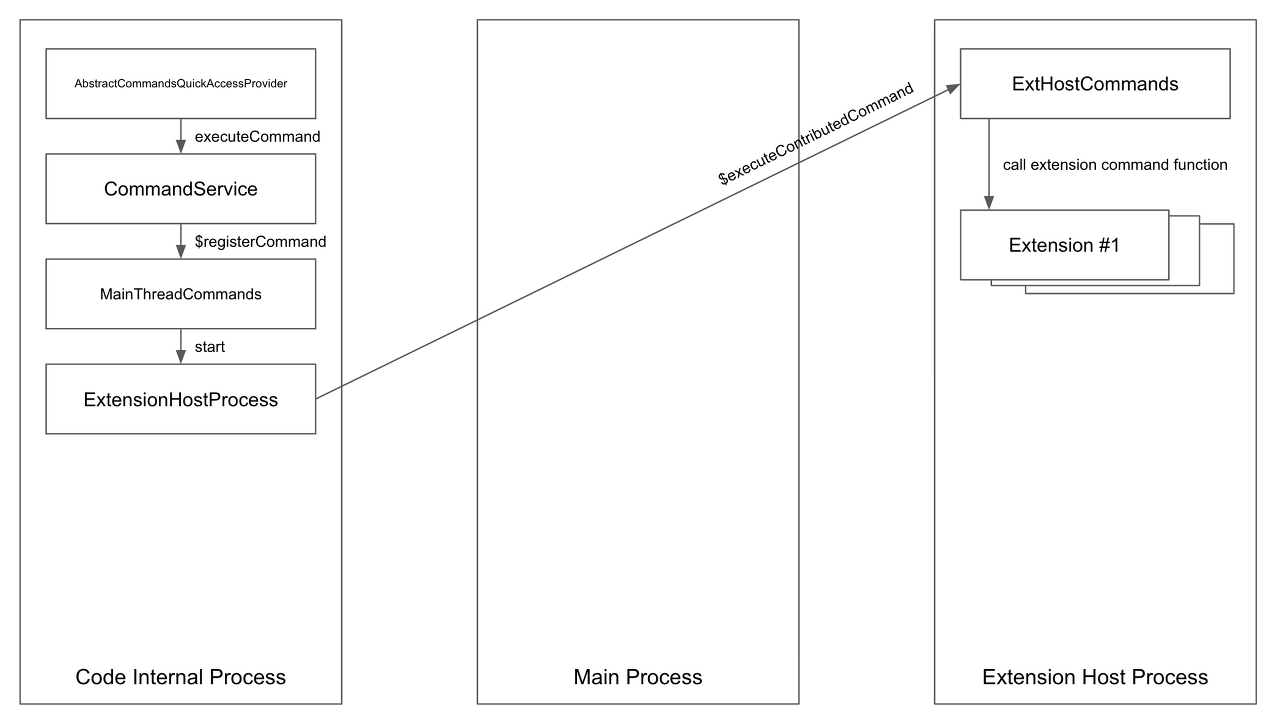유저가 커맨드 팔레트를 통해 커맨드를 실행하면 해당 커맨드를 등록한 익스텐션이 호출되게 되는데 이 익스텐션을 로드한 Extension Host Process에 IPC/RPC 을 넣어 해당 Extension Host Process 에서 실행되게 한다.