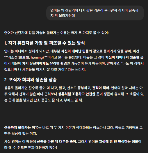 - 연어로 시작된 궁금함이 ChatGPT 덕에 또 다른 배움으로 이어질 수 있었다.