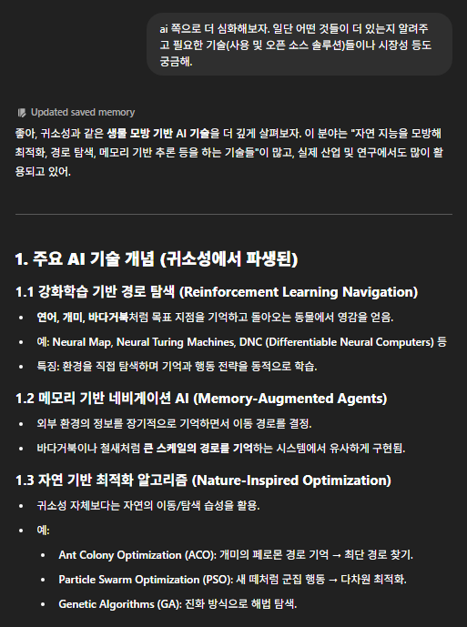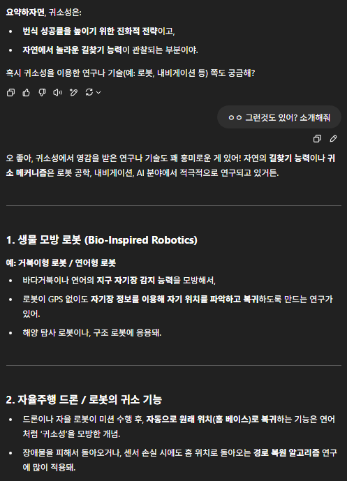 그런데 요즘 ChatGPT 가 나를 학습해서 그런지 '귀소성'이라는 키워드에 기술관련된 부분이 궁금할지 역으로 제안한다. 하릴없이 나는 질문에 걸려들었고 주제를 틀어 계속 대화를 이어가봤다.