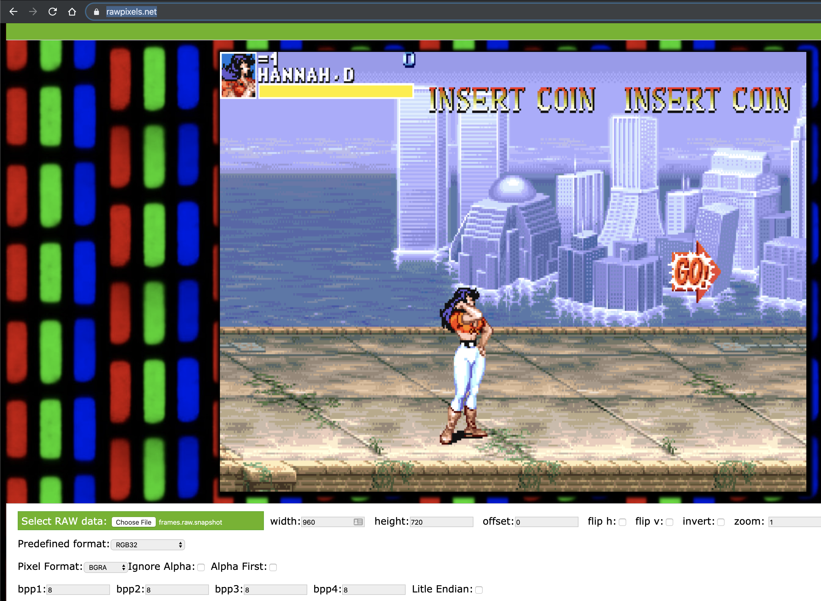 이 파일로 부터 읽은 이미지 프레임 스냅샷 한장을 열어보니.. 이럴수가 진짜 나온다. 야호! (Pixel 배열이 BGRA이라 온라인 컨버터로 변환해보니 잘 나옴)