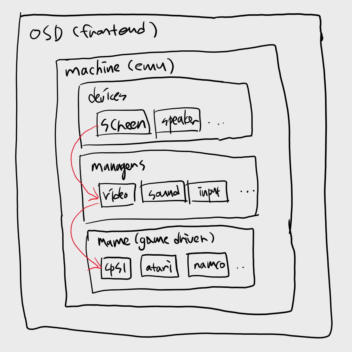 크게 OSD(On Screen Display) Layer 와 Emulator Machine 로 구성된다. OSD는 일종의 Presenter 영역으로 mac, sdl, windows 등이 있는데 기본은 sdl 로 되어있다. 나중에 우리는 이 OSD 영역에서 UI가 없는 Headless OSD 를 만들면 될 것 같다. OSD 가 의존하고 있는 Emulator Machine 이 Core 인데, machine.h 파일로부터 따라가볼 수 있다. 디바이스, 각종 매니저들, 게임 드라이버들을 모두 품고 있다.