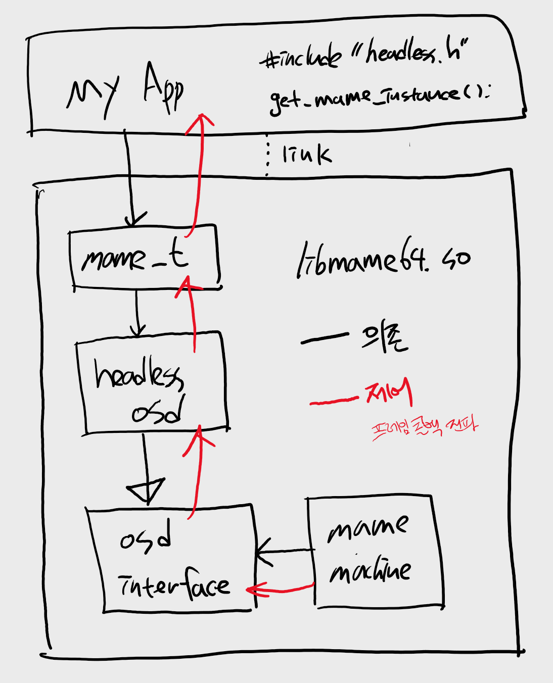우리가 만들어내려고 하는 MAME Headless Library와 이를 사용하는 클라이언트(앱)의 구조는 아래 그림처럼 가려고 한다. 검은색은 의존의 방향이고 빨간색은 제어의 방향이다. mame machine 이 다른 계층에 있는 headless osd 를 직접 의존하지 않기 위해 인터페이스를 이용해 의존하고 있는데(DIP) 그 인터페이스가 osd interface 이다.