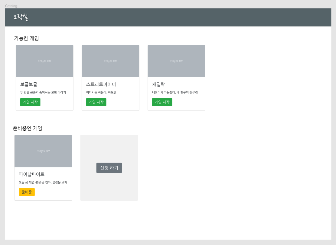 미리 나열된 게임 목록을 확인할 수 있다. 게임 하나씩 기간별로 로테이션을 할지 걍 몇가지 풀어놓을지 조금 고민도 했었는데 Don't be so serious! 일단 되는대로 몇개만 풀어 놓는 방식으로 해보기로.